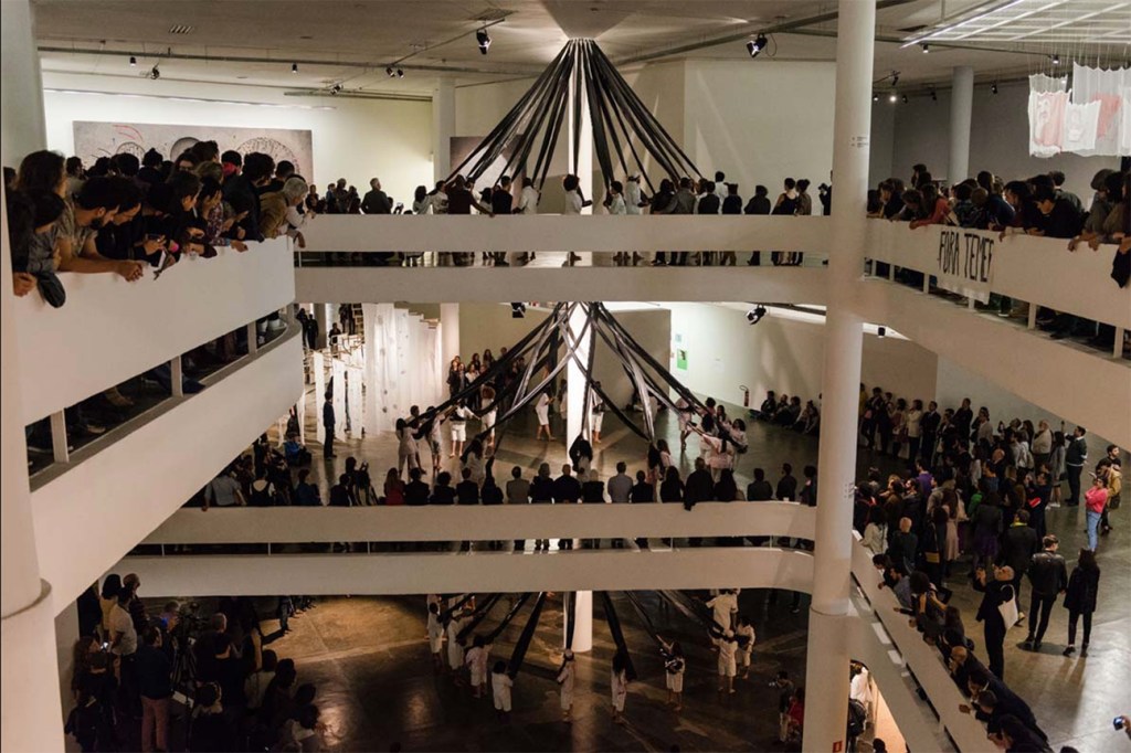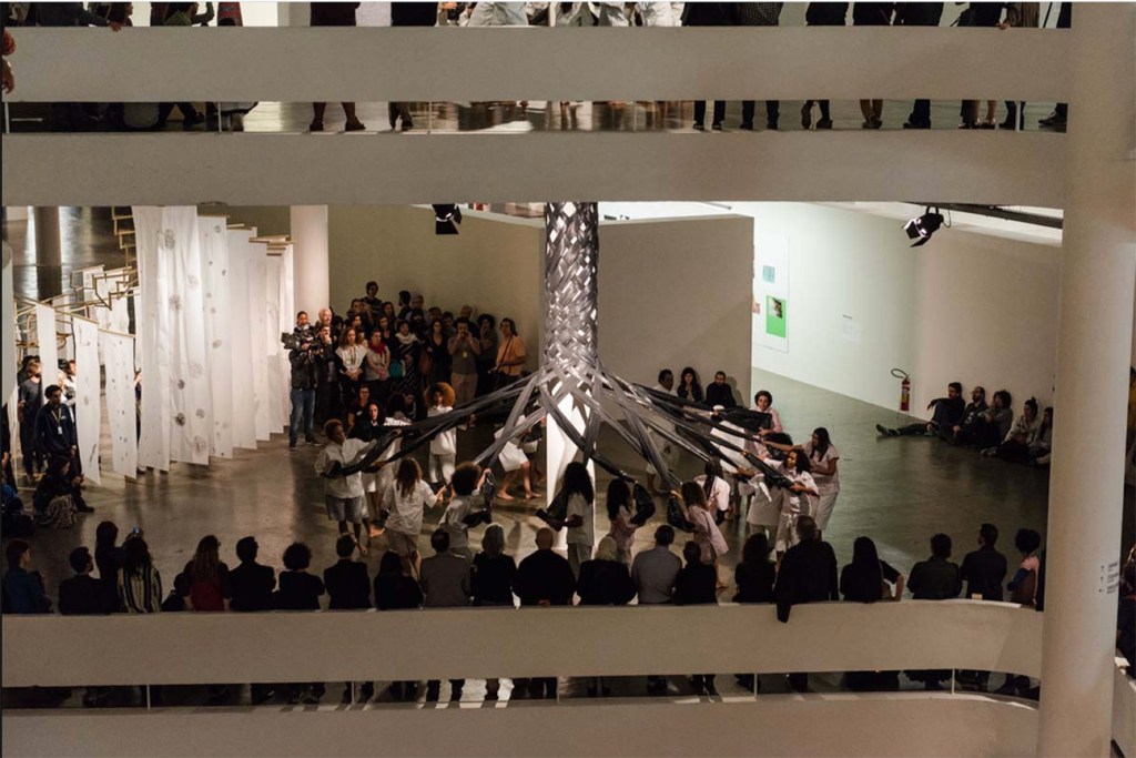 Starting from the tradition of the maypole dance, Cristiano Lenhardt covers one of the pavilion’s columns with interwoven fabrics in a performative action. A mesh was created through the choreography of 60 dancers, distributed around a single column which spans the pavilion’s three floors. The performance was accompanied by mantras for the creation of an energy field.